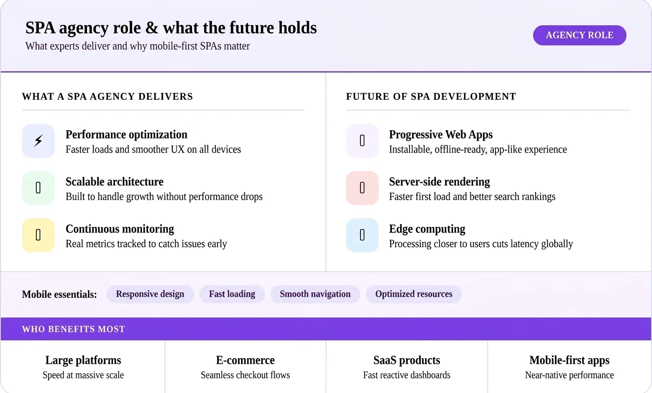Constant innovation is the future of the development of SPA. The future of the web application is shaped by such technologies as Progressive Web Applications (PWAs), server-side rendering, and edge computing.
